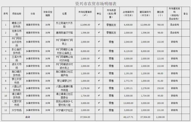 本次拍卖的农贸市场共12个,总占地面积4.81万㎡,总建筑面积(市场经营面积)3.75万㎡,摊位总计2280个。其中资兴市城区2个,摊位总数878个;州门司镇4个,摊位总数716个;滁口镇、蓼江镇、八面山瑶族乡、清江镇、回龙山瑶族乡、兴宁镇各1个,摊位数61-183个,总计686个。